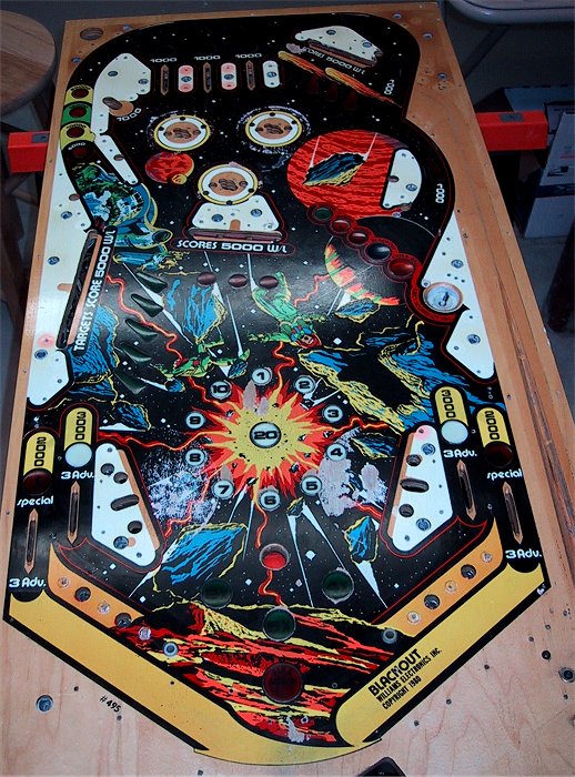Game Restoration - Part 2 January 27, 2002 - Playfield Restoration This was supposed to be the easy and fun part. I finished stripping down the playfield by removing absolutely everything from the top of the playfield (see below). All of the metal parts were dumped into the tumbler and cleaned. I checked all of the playfield parts to see what looked marginal and needed to be replaced, then placed the order with Pinball Resource. You may notice in the photo below that there is an extreme amount of wear around the slings. The Mylar had been added around the sling shots after the playfield had already been worn down to the wood. In order to repair the worn areas, the Mylar had to come off. If you've read my Mylar Removal page, then you know that I recommend using "Goo-Gone" to remove Mylar. However, I had been reading on rec.games.pinball about a method of removing Mylar that utilizes "freeze spray". Freeze spray is commonly used to cool components on a circuit board to find heat faulty parts. I needed to purchase a can for this reason anyway, so I bought two cans and figured I'd give it a shot! |