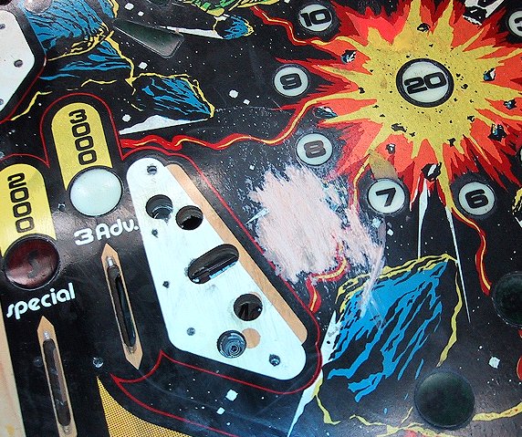 Game Restoration - Part 3 March 7, 2002 -Continued Playfield Restoration (Slow going!) If you're following along, I wanted to give you a quick update of what's happening. The playfield has turned into a worse problem than I had imagined starting out. What was supposed to be about a 30 day project is now into its fourth month... The problem started with my attempt to remove the slingshot Mylar with freeze spray. The Mylar had been applied after the playfield started wearing down, and the freeze spray removal method brought up a huge amount of paint. If you remember from part 2, I tried using a brush to repaint the black and the "asteroid" (rocks as I've been calling them) by the sling. The results were less than desirable to say the least. The paint underneath was already cracking, and the results had so many ridges I'd be afraid of how the ball would travel! I decided to take the